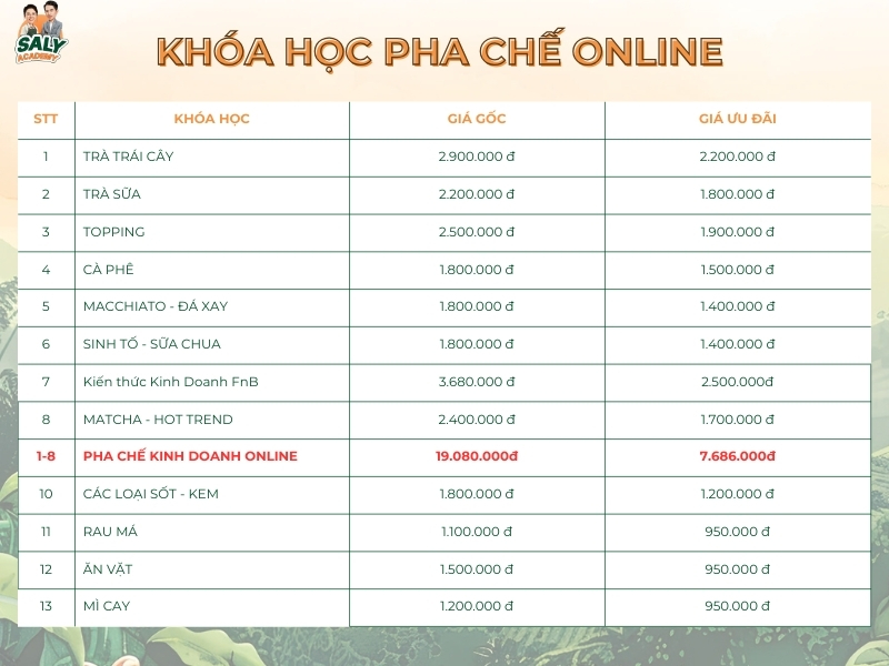 Nhiều trung tâm đào tạo nghề pha chế chuyên nghiệp hiện nay có các khóa cơ bản với học phí từ 5.000.000 đến 15.000.000 VNĐ. Ví dụ, khóa học pha chế trà trái cây có giá gốc 3.200.000 VNĐ nhưng đang được ưu đãi chỉ còn 2.500.000 VNĐ. Điều này giúp bạn có nhiều lựa chọn hơn để bắt đầu hành trình pha chế.