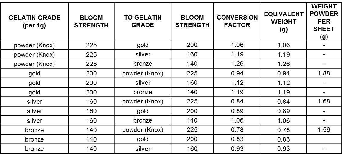 Ngược lại, gelatin bột thì đa dạng về độ bloom, phù hợp cho nhiều mục đích khác nhau, từ nấu ăn đến chế biến thực phẩm. Tuy nhiên, bột thường có mùi hơn và có thể ảnh hưởng đến hương vị của món ăn. Phần lớn các đầu bếp và người làm bánh chọn gelatin lá bởi tính chính xác và dễ sử dụng hơn.