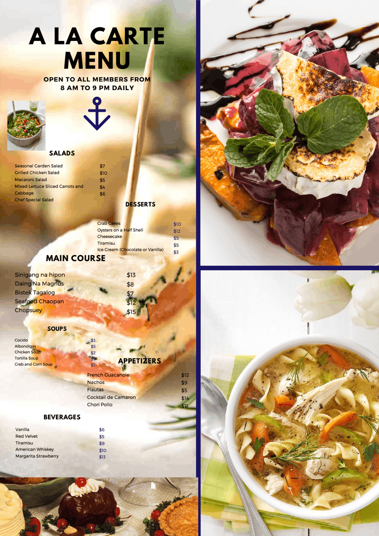 Ngoài ra, canh chua cá là một món ăn đặc trưng cho sự cân bằng giữa vị chua, cay, mặn, ngọt. Những món này không chỉ phong phú về hương vị mà còn được trình bày đẹp mắt, thu hút ánh nhìn và khơi dậy sự thèm ăn. Thực đơn A La Carte thật sự mang lại trải nghiệm ẩm thực tuyệt vời cho những ai yêu thích sự lựa chọn đa dạng.
