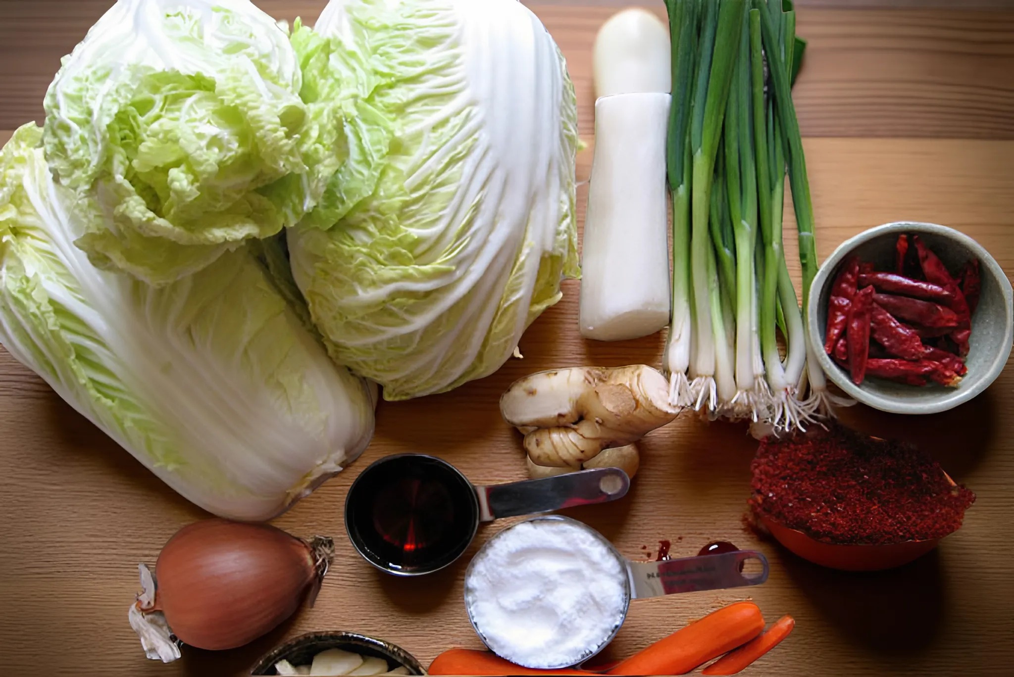Kim chi là một món ăn truyền thống hấp dẫn của Hàn Quốc, nổi bật với vị chua, cay đặc trưng và màu sắc bắt mắt. Nguyên liệu chính để làm kim chi không thể thiếu cải thảo, thường là từ 2 đến 3 kg, tùy thuộc vào số lượng bạn muốn làm. Cải thảo sẽ được muối trước để tạo độ giòn và hương vị.