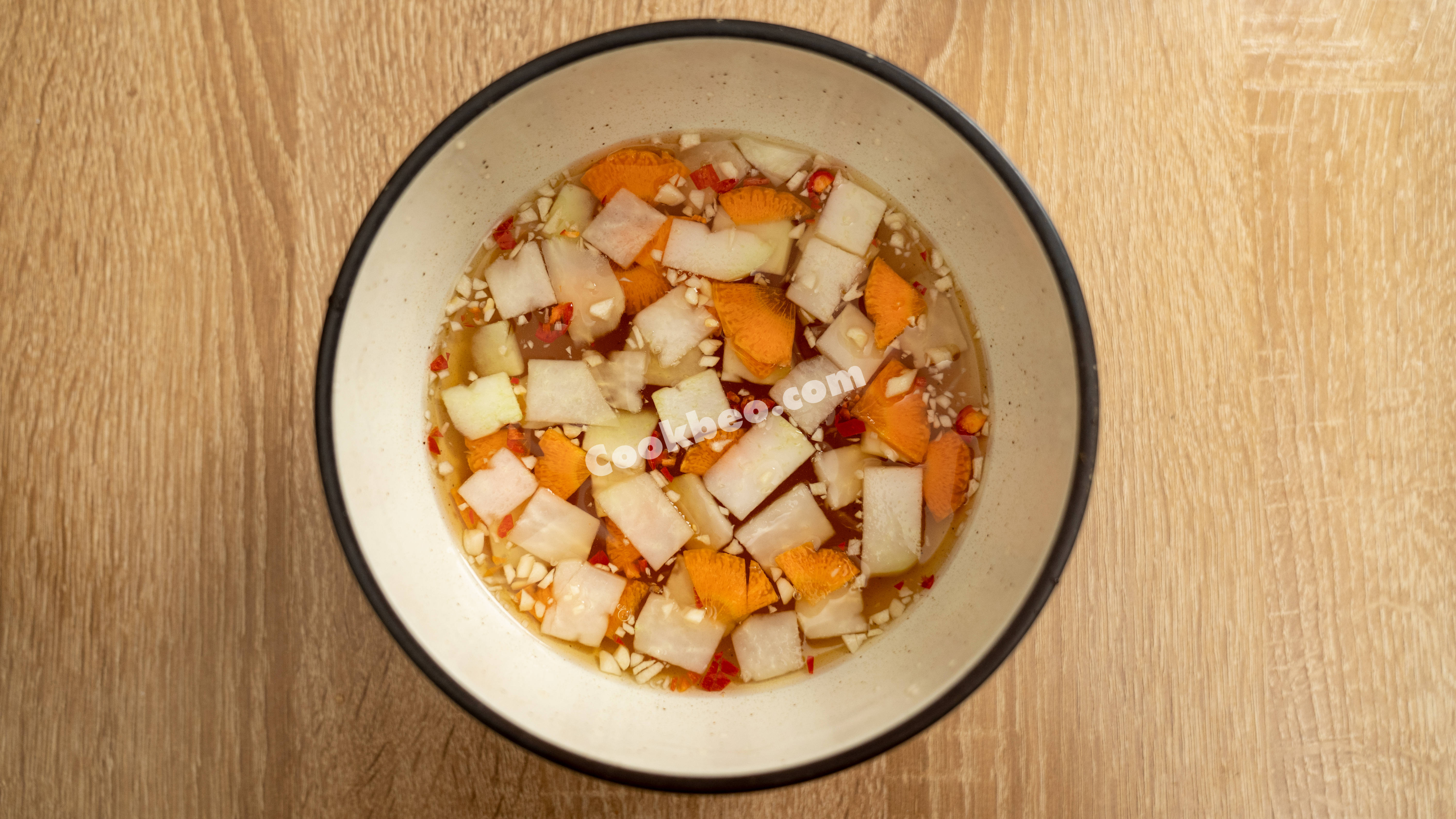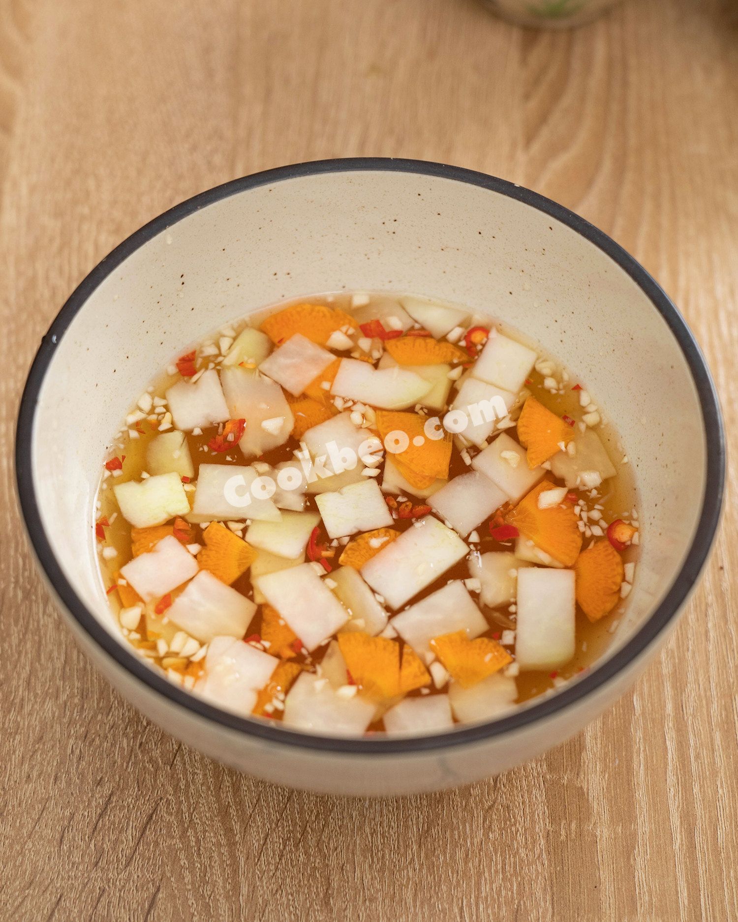 Sau khi chuẩn bị đủ nguyên liệu, hãy cho nước mắm, đường, giấm và nước lọc vào chén. Khuấy đều để đường tan hoàn toàn và các hương vị hòa quyện với nhau. Nếm thử và điều chỉnh cho phù hợp với khẩu vị của bạn. Nếu bạn thích vị cay, hãy thêm tỏi băm và ớt vào hỗn hợp này.