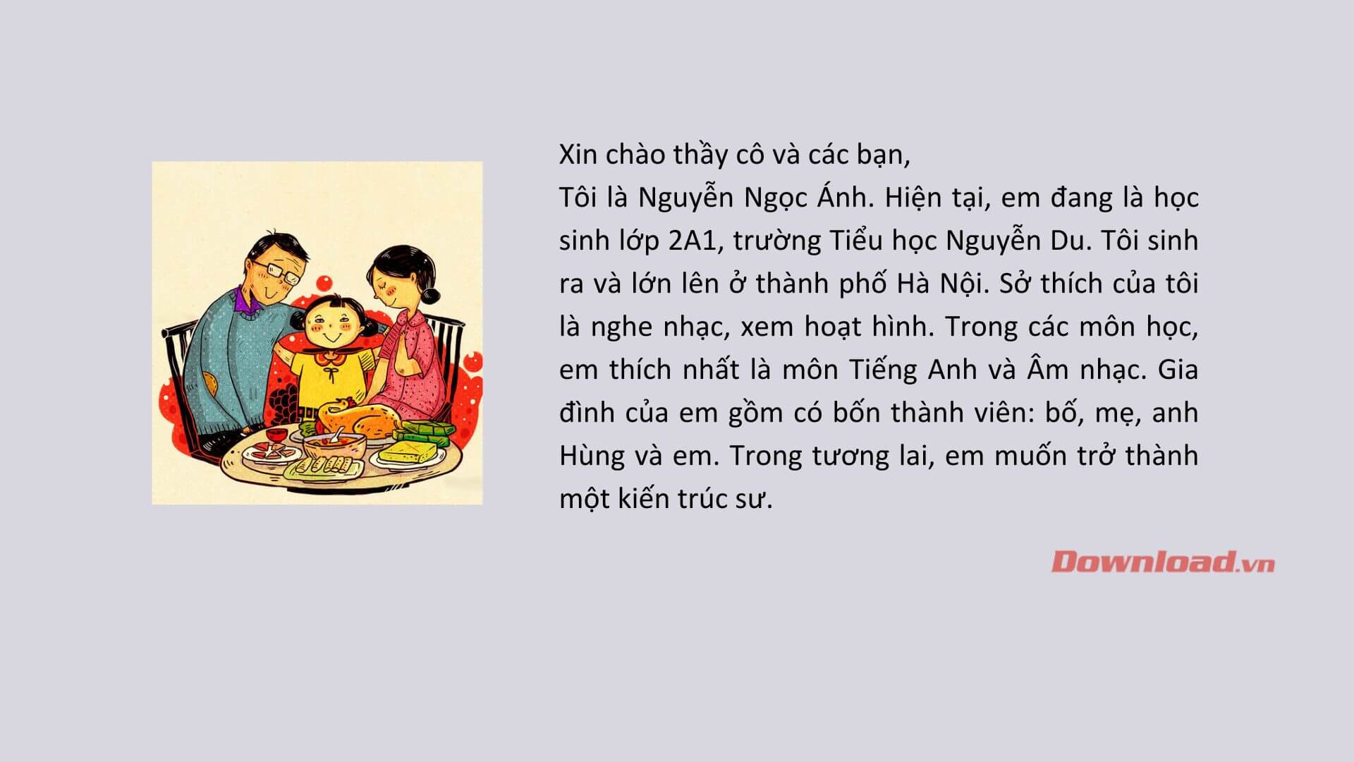 Xin chào mọi người! Mình tên là Nguyễn Văn An, 11 tuổi, hiện đang học lớp 5 tại trường Tiểu học Trần Hưng Đạo. Mình sống tại Hà Nội, nơi có nhiều điều thú vị để khám phá. Gia đình mình có bốn người: bố, mẹ, em gái và mình. Mỗi ngày trôi qua, mình luôn cố gắng học tập chăm chỉ để làm cho gia đình tự hào.