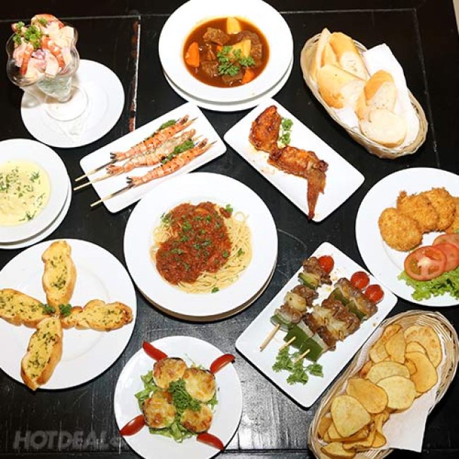 Mỗi set menu thường bao gồm từ khai vị cho đến tráng miệng, với những món nổi bật như salad sò điệp và mực chiên xù là lựa chọn khai vị đầy hấp dẫn. Tiếp theo là món chính với các món như mì Ý hải sản, bò bít tết sốt tiêu đen kiểu Pháp, cùng với khoai tây chiên giòn tan. Những món này không chỉ ngon mà còn được trình bày rất bắt mắt, khiến bạn khó có thể cưỡng lại.