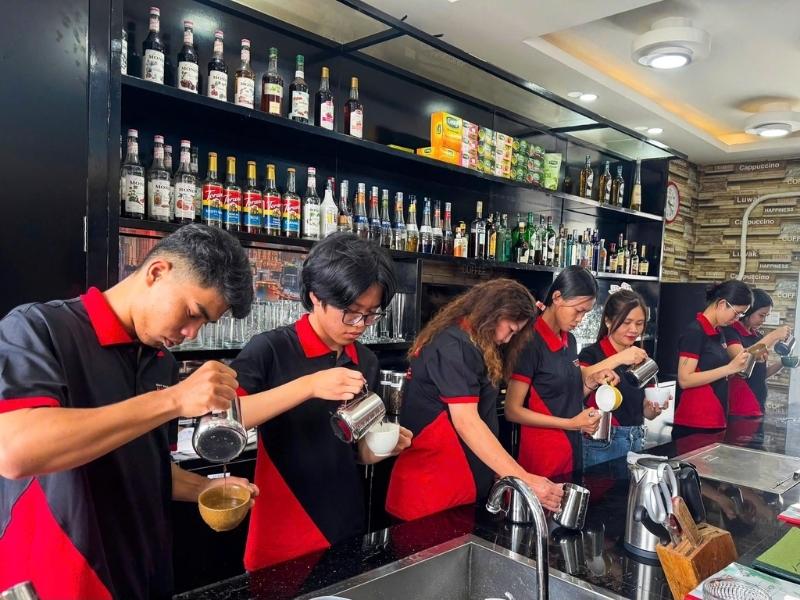 Khóa học kéo dài gần 1,5 tháng với học phí 10.000.000đ, nhưng bạn sẽ được trải nghiệm hơn 60 thức uống phổ biến và hấp dẫn. Ngoài ra, các học viên cũng có thể tham gia lớp Barista cấp tốc với mức học phí chỉ 500.000đ, giúp họ nắm bắt ngay kiến thức cơ bản về cà phê.