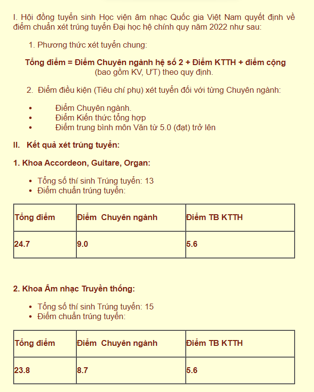 Điểm tốt nghiệp chuyên ngành yêu cầu từ 9.0 trở lên, trong khi chuyên ngành Piano còn cao hơn với 9.5 điểm. Không chỉ có vậy, thí sinh cũng cần chú ý đến điểm trung bình chung các môn thuộc khối Kiến thức âm nhạc tổng hợp, vì đây là yếu tố quan trọng trong quá trình xét tuyển.