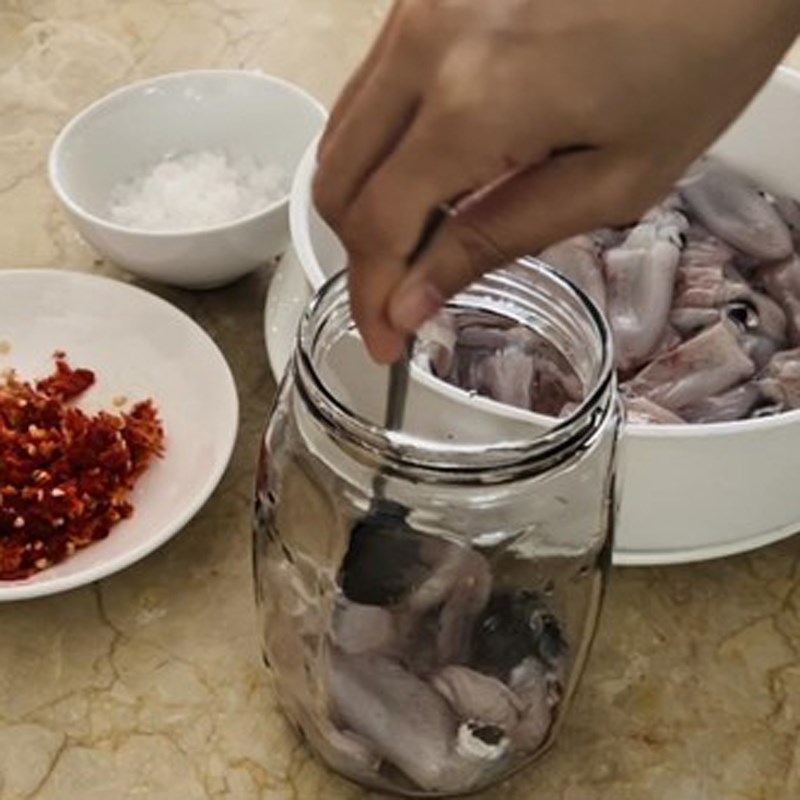 Để tiến hành muối mắm mực đúng cách, trước hết bạn cần chuẩn bị một cái hũ nhựa hoặc hũ thủy tinh đã được rửa sạch và lau khô. Bắt đầu bằng cách cho vào hũ một lớp muối hạt dày, tiếp theo là một lớp mực tươi ngon và sau cùng là lớp ớt. Bạn cứ lần lượt lặp lại quy trình này cho đến khi hết nguyên liệu. Khi đã xong, đậy nắp hũ thật kín để tránh không khí vào bên trong.