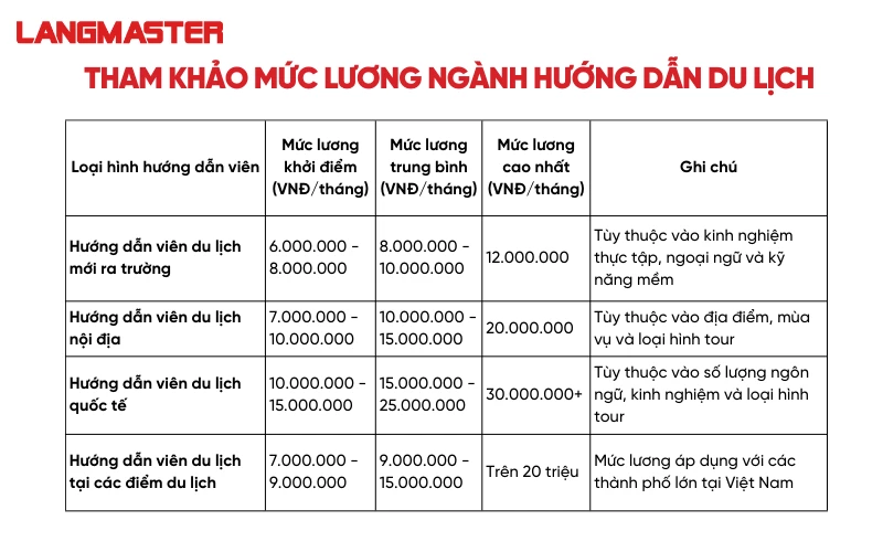 Ngành hướng dẫn du lịch đang phát triển mạnh mẽ tại Việt Nam và hứa hẹn sẽ mang đến nhiều cơ hội tăng lương hấp dẫn trong tương lai gần. Dự báo đến năm 2025, mức lương cho hướng dẫn viên nội địa sẽ dao động từ 10 đến 25 triệu đồng mỗi tháng, tùy thuộc vào kinh nghiệm và quy mô công ty. Những người mới vào nghề thường có mức lương khởi điểm từ 5 đến 8 triệu đồng, nhưng với nỗ lực tích cực và kỹ năng tốt, họ có thể nâng cao thu nhập nhanh chóng.