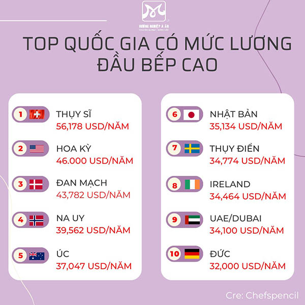 Điều này cho thấy, với sự chuyên môn hóa và kỹ năng hoàn thiện, đầu bếp hoàn toàn có thể kiếm được những khoản thu nhập đáng mơ ước. Đặc biệt, ở nước ngoài, mức lương của đầu bếp có thể dao động từ 3.000 đến 9.000 USD/tháng, tạo ra một động lực lớn cho những ai yêu thích nghề nghiệp này.