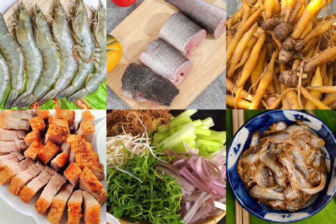 Bên cạnh mắm, bạn còn cần những nguyên liệu như tôm tươi, mực ống, thịt heo quay, chả cá thác lác và xương sườn để nấu nước dùng. Tôm và mực tươi, mỗi loại khoảng 200-400g, sẽ tạo thêm sự tươi ngon, trong khi thịt heo quay và chả cá thác lác mang đến độ béo ngậy đặc trưng. Đừng quên thêm một chút sả, ớt và hành tím băm để tạo nên hương vị thơm phức.