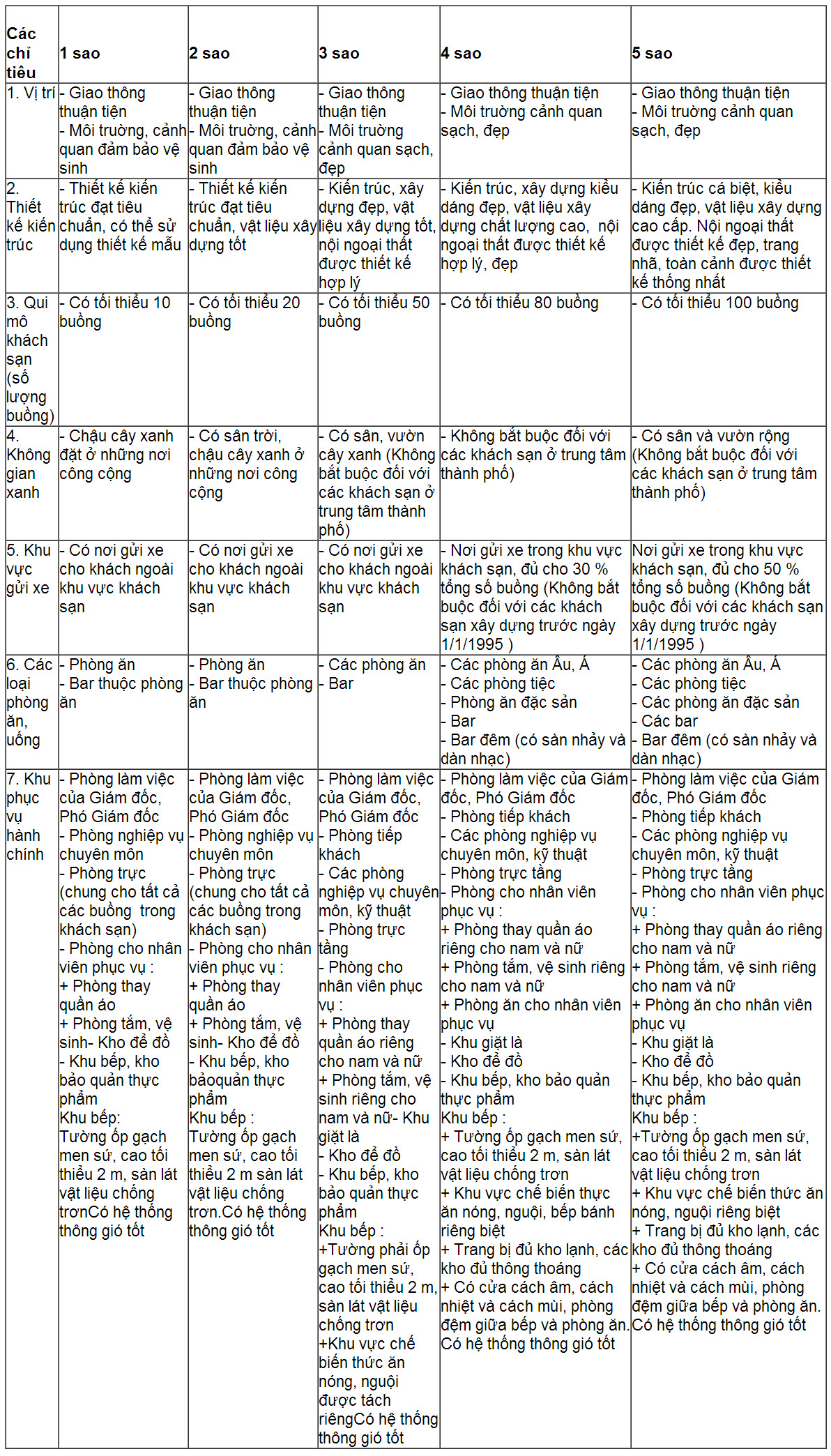 Kiến trúc của khách sạn 5 sao cần phải nổi bật và ấn tượng, với các khu vực tiện nghi như hồ bơi, sân vườn và khu vực tiếp khách. Diện tích phòng ngủ cũng được quy định rõ ràng, phải rộng rãi và được trang bị đầy đủ tiện nghi hiện đại, đảm bảo sự thoải mái tối đa cho khách lưu trú.