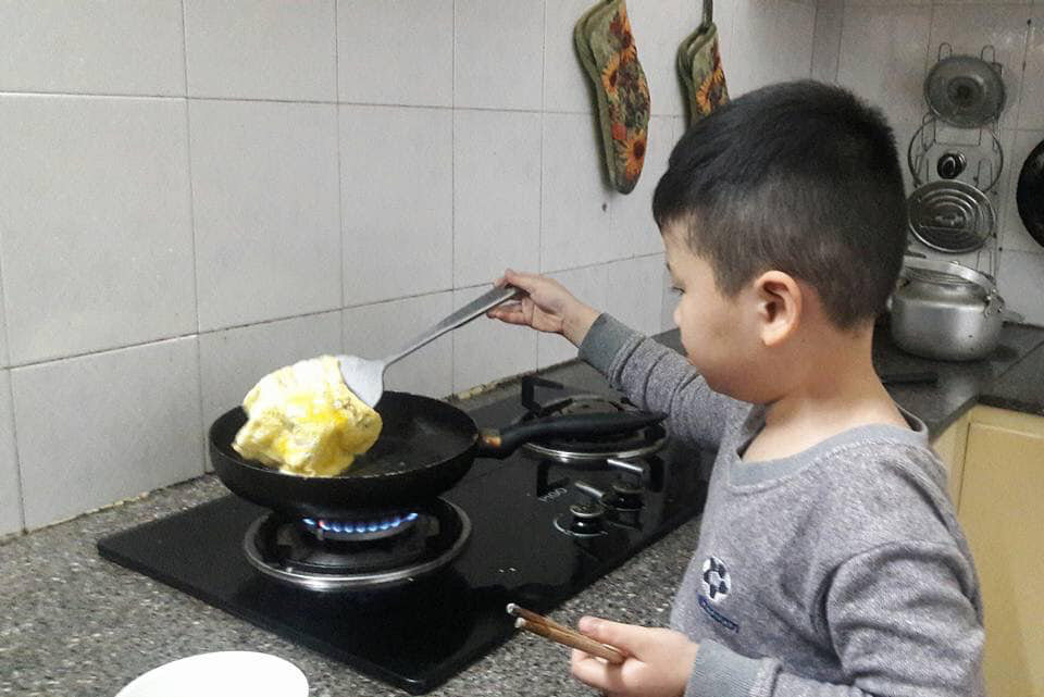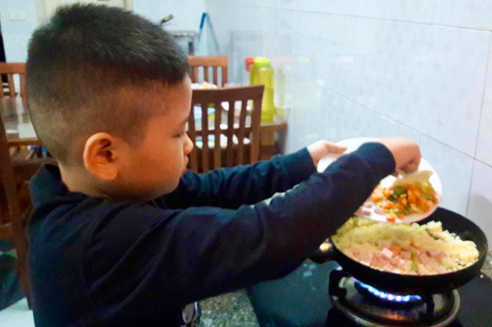 Bé con tí hon tự tin bật bếp nấu bữa cơm